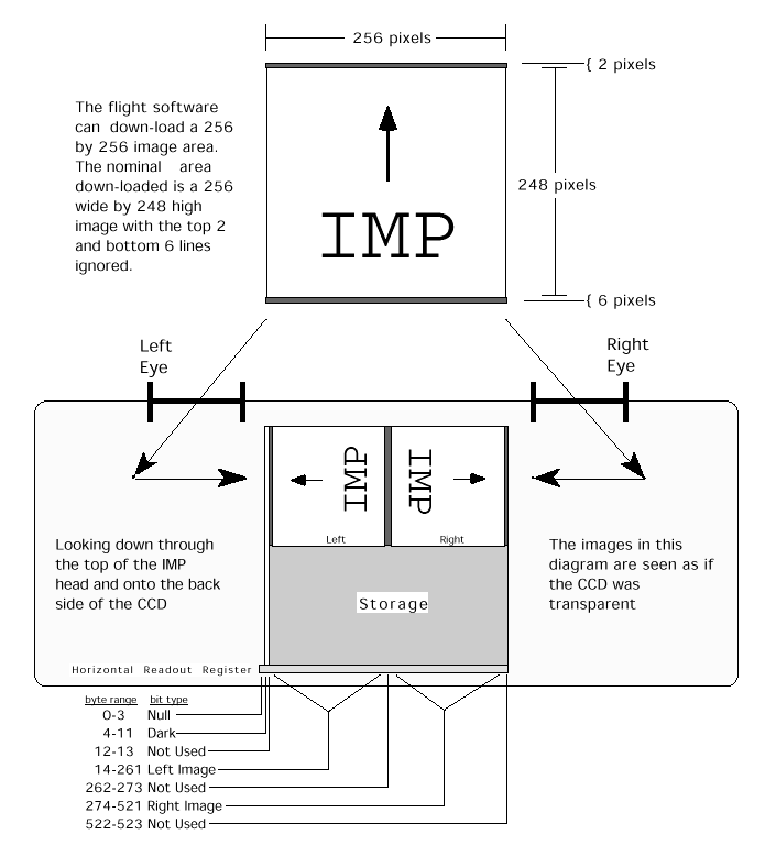The onboard data processing stream begins by dropping the anti-blooming gates to clear charge in the imaging area of the 512 square CCD, which comprises only the upper 256 rows. Designed for stereo imaging, the first 256 columns in the imaging area correspond to the left image and the second 256 columns are reserved for the right image. Exposure begins when the anti-blooming gates are raised and electrons begin to accumulate in the pixel charge wells. At the end of the set exposure time, the image is shifted row by row to the lower 256 rows in the CCD that make up the storage area, taking less than 0.5 milliseconds. During this time additional electrons build up in the active area, causing the last row transferred to have a longer exposure than the first. The DN's are then read out to the frame buffer board, which takes about 1.25 seconds, and digitized to 12 bits. Optionally, a zero-exposed frame can be subtracted at this point. One complete set of left and right IMP images can remain in the frame buffer board long enough to be read by the onboard computer into main memory. This frame transfer capability of the CCD avoids the need for a mechanical shutter by effectively working as an electronic shutter. The complete transfer time is referred to as the 'shutter effect'.