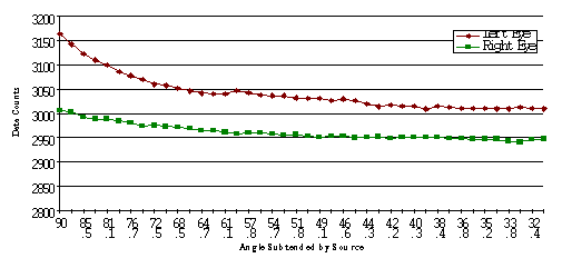 The forward scattered stray light was integrated by using a large white target with a small black area in the center. In the absence of forward scattered stray light, the black center portion of this target should image near the level of dark current. Thus, by looking at the number of data counts in the black region versus the white region of the target, the forward scattered stray light may be measured. As the target approached the camera from the distance at which it just filled the field of view, the size of the black area increased (ie the angle which it subtended). This caused a decrease in the amount of forward scattered light into the center of the field of view. The integrated forward scattered light at the center of the field of view is about 3% in each eye.