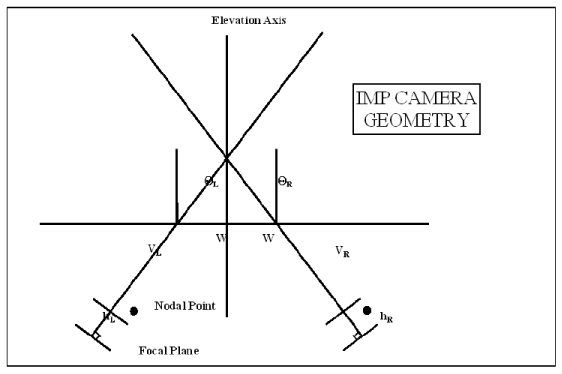 The optical system has a toe-in that varies slightly with the wavelength of the observation. For filter wheel position 5, the stereo filters centered on 670 nanometers, the toe-in is 13.05° in the left eye and -24.68° in the right eye. This provides complete viewing overlap at 4 meters distance and assure maximum stereo performance in the zone 2-10 meters from the spacecraft. The effective pixel resolution is 0.981 milliradians per pixel in the left eye and 0.985 milliradians per pixel right eye. Details of the optical performance of the IMP are listed in Chapter 2 of this guide and in the IMP calibration report available electronically on the IMP home page http://lpl.arizona.edu.