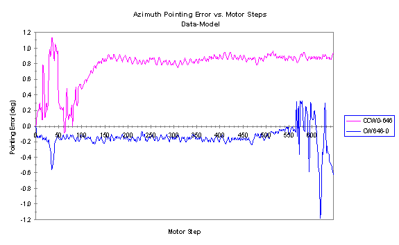 Figure shows the observed error from AZ two step pointing data going from 0 motor counts to 646 motor counts and then returning.