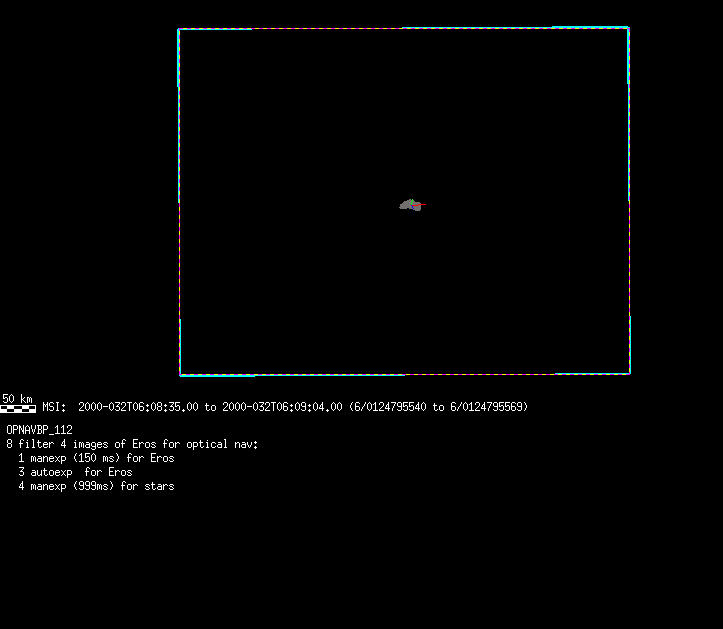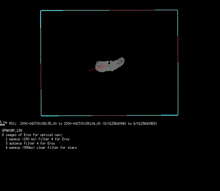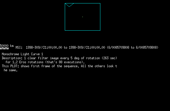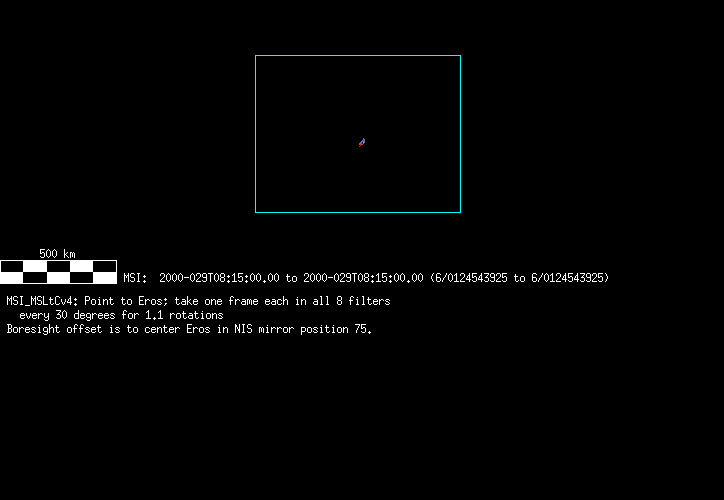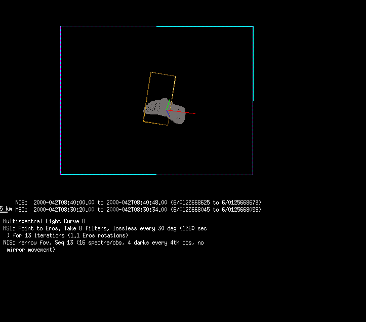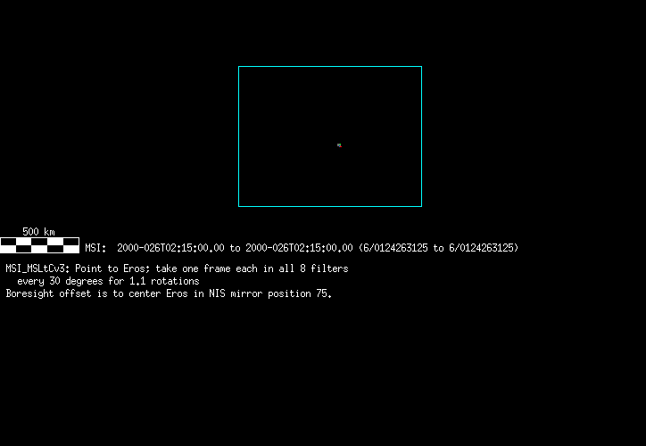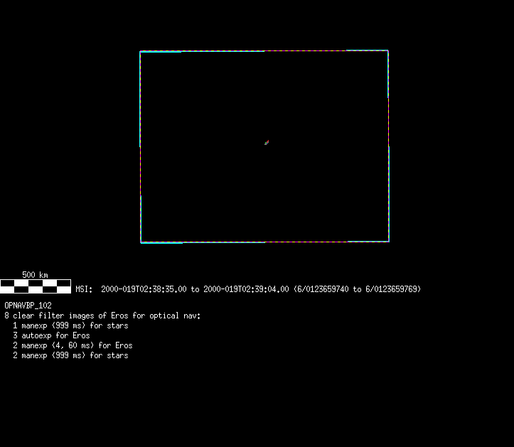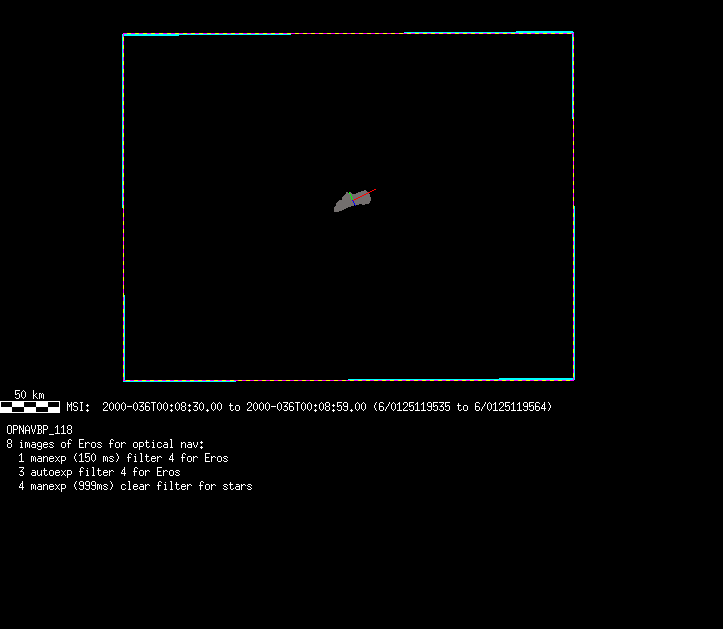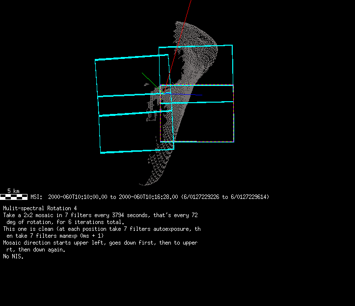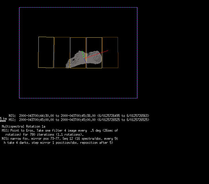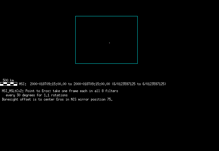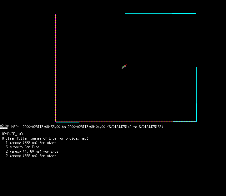 | 86766 km | 85 | MultispctrlRotSeq | 1999-353 | 99347 | 0121048322-0121070756 | 1999-353T21:14:58 | 1999-354T03:28:52 | 18,25 | 0,1,2,3,4,5,6,7 | 820 | 0 | MultispctrlRotSeq | One filter 4 image (table5+fast) every 1/2 deg of rot for 1.1 Eros rotation; afterward, 8 filters (autoexp, fast) every 10 deg for 5 iterations (50 deg of Eros rotation). Eros=4 short pixels | approachmovies.txt | multispctrlrotseq.gif | |||