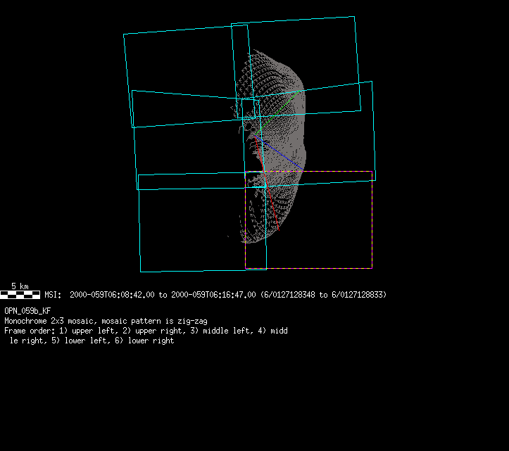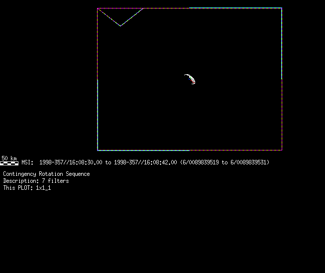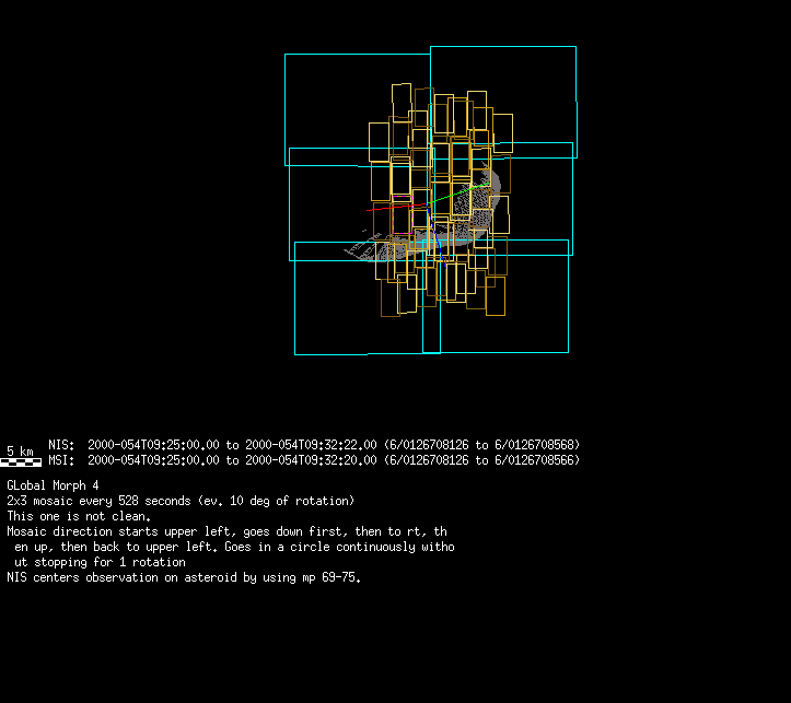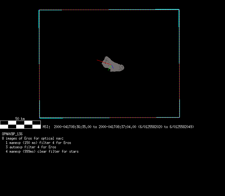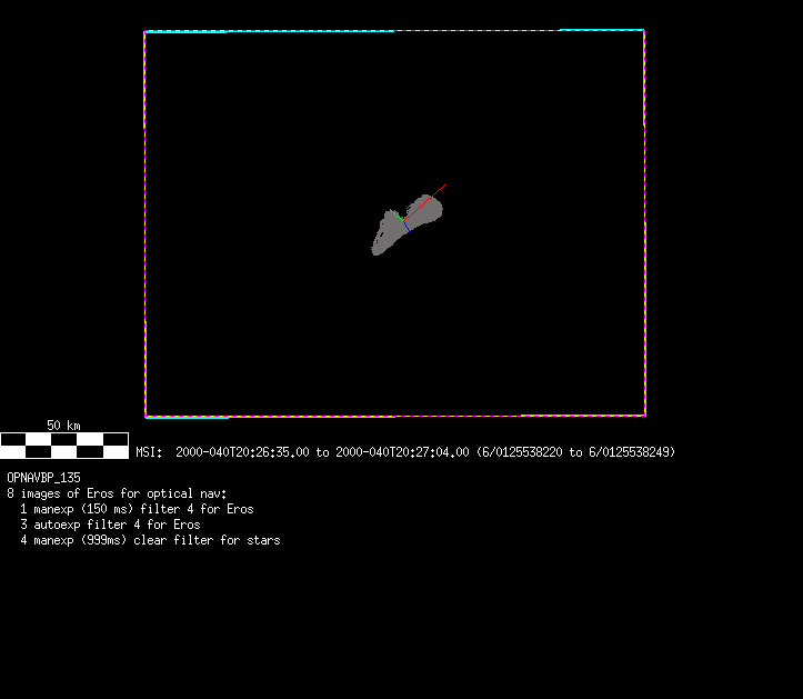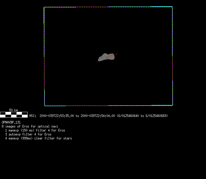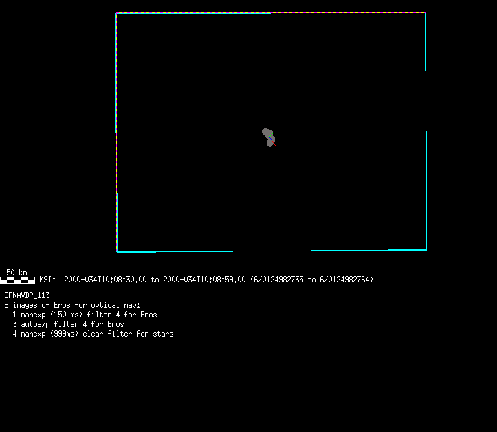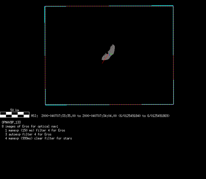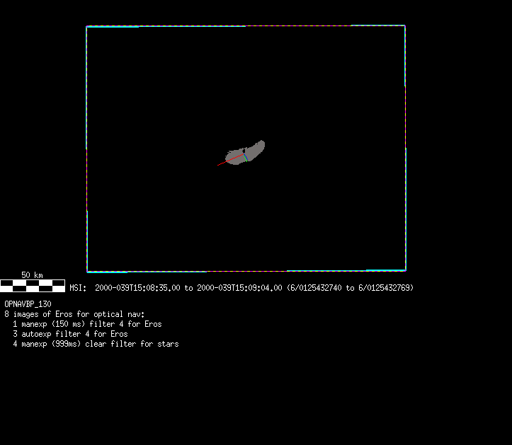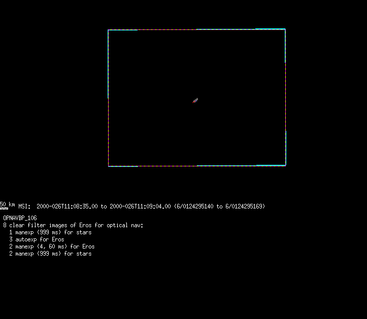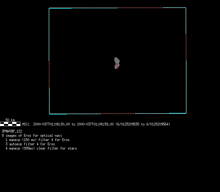 | 86766 km | 85 | MultispctrlRotSeq | 1999-353 | 99347 | 0121048322-0121070756 | 1999-353T21:14:58 | 1999-354T03:28:52 | 18,25 | 0,1,2,3,4,5,6,7 | 820 | 0 | MultispctrlRotSeq | One filter 4 image (table5+fast) every 1/2 deg of rot for 1.1 Eros rotation; afterward, 8 filters (autoexp, fast) every 10 deg for 5 iterations (50 deg of Eros rotation). Eros=4 short pixels | approachmovies.txt | multispctrlrotseq.gif | |||