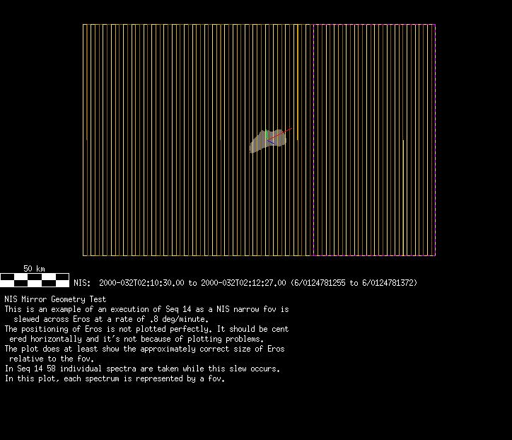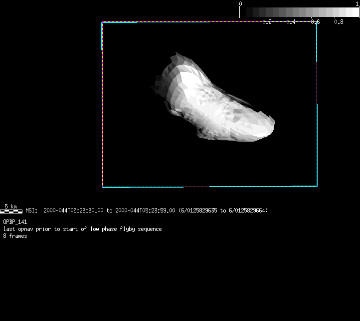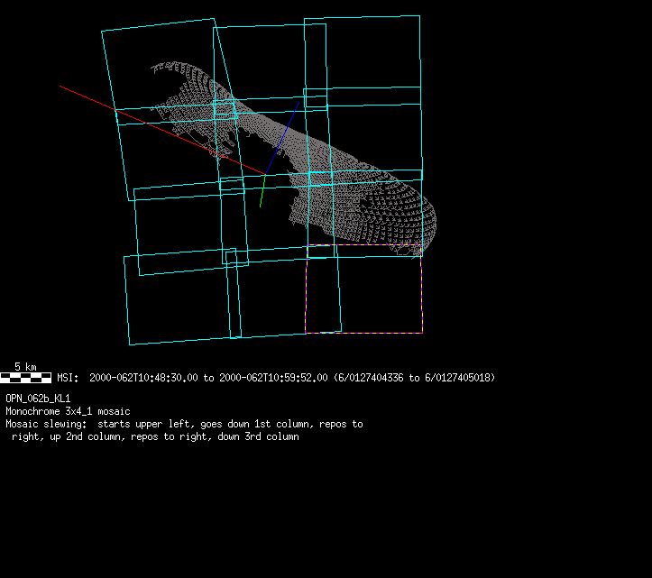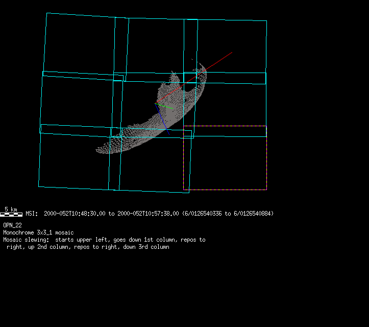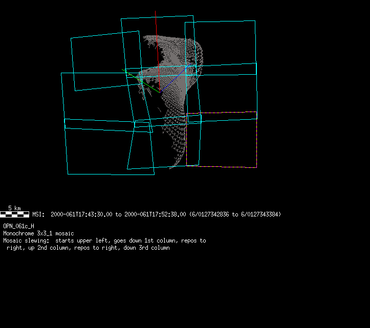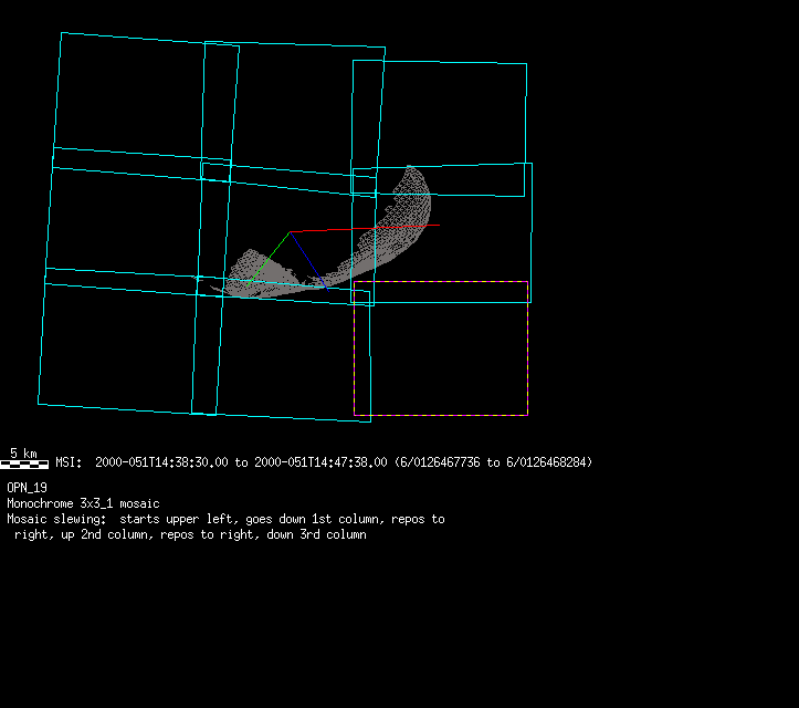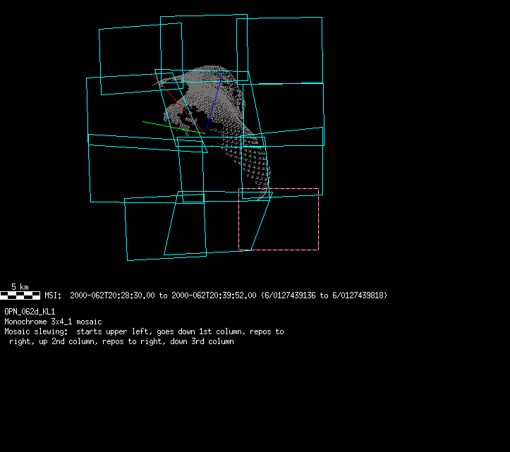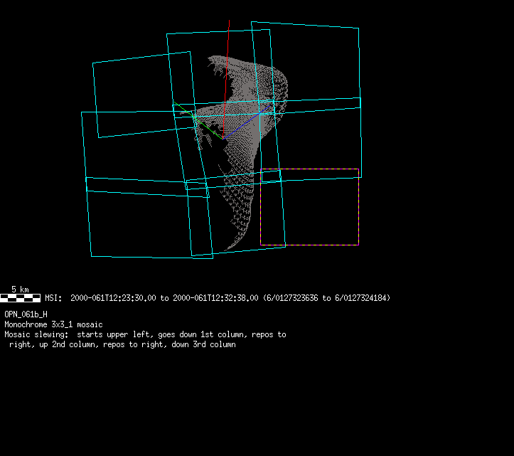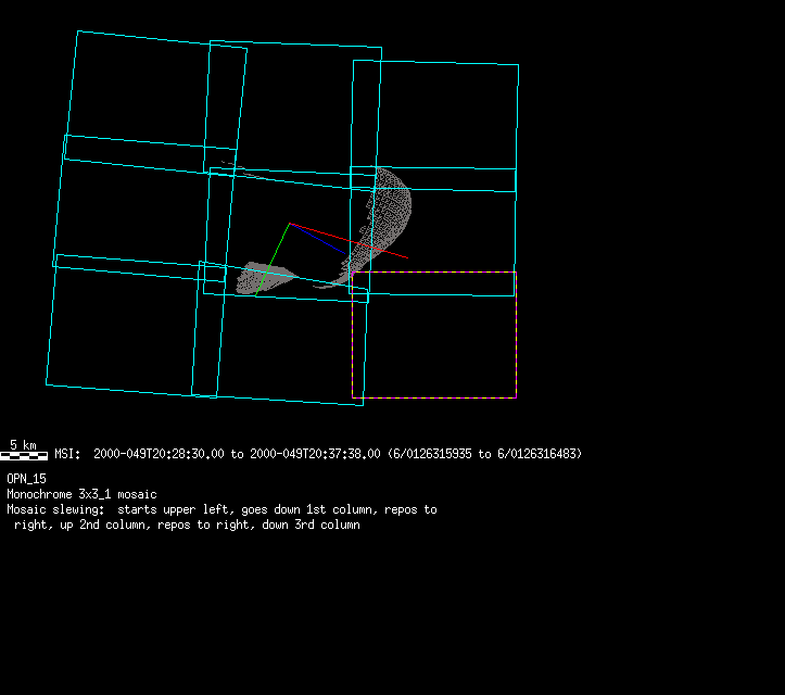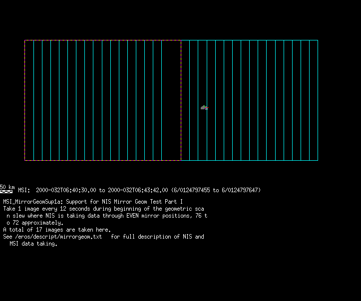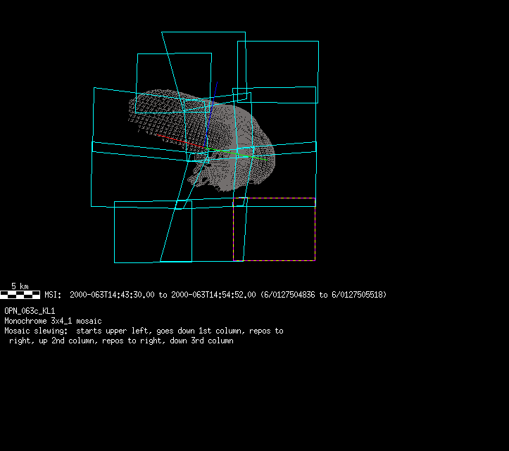 | 86766 km | 85 | MultispctrlRotSeq | 1999-353 | 99347 | 0121048322-0121070756 | 1999-353T21:14:58 | 1999-354T03:28:52 | 18,25 | 0,1,2,3,4,5,6,7 | 820 | 0 | MultispctrlRotSeq | One filter 4 image (table5+fast) every 1/2 deg of rot for 1.1 Eros rotation; afterward, 8 filters (autoexp, fast) every 10 deg for 5 iterations (50 deg of Eros rotation). Eros=4 short pixels | approachmovies.txt | multispctrlrotseq.gif | |||