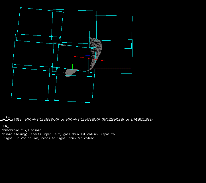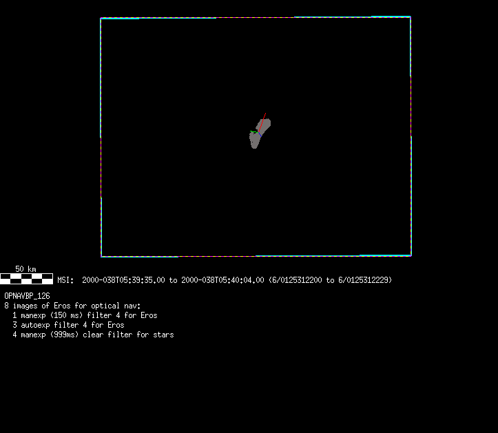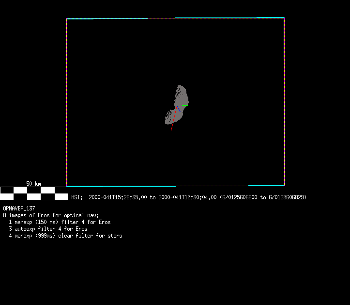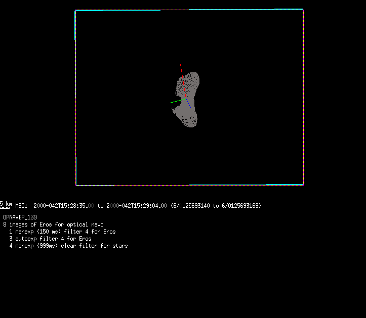 | 685028 km | -35 | Opnav_BPrime_N2 | 1999-001 | 98361 | 0090588709-0090588738 | 1999-001T08:14:55 | 1999-001T08:15:24 | 29,8,9 | 0 | 8 | 0 | lossless | Opnav_BPrime_N2 | 8 images (5 exposed for Eros, 3 for stars) | opnav.txt | . | ||