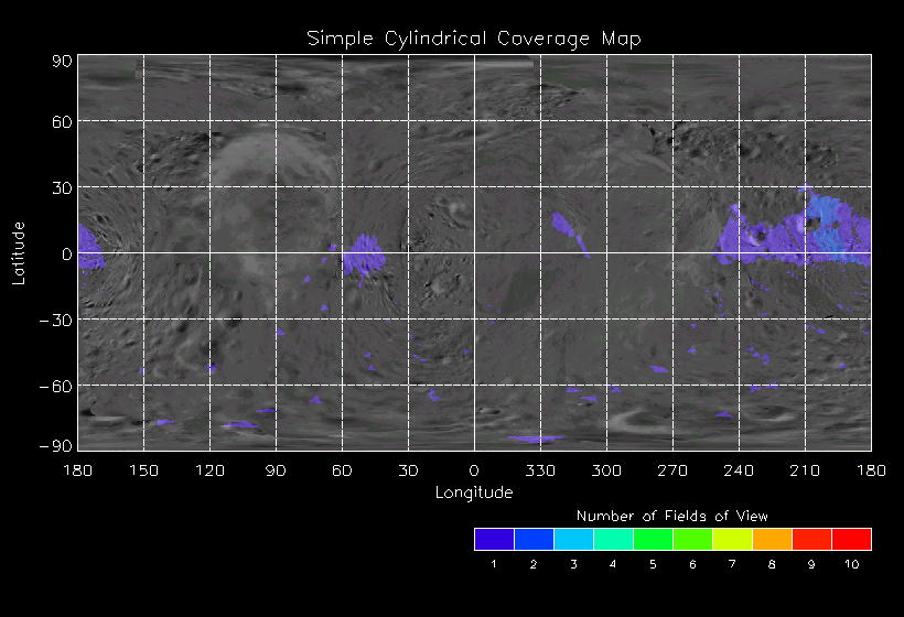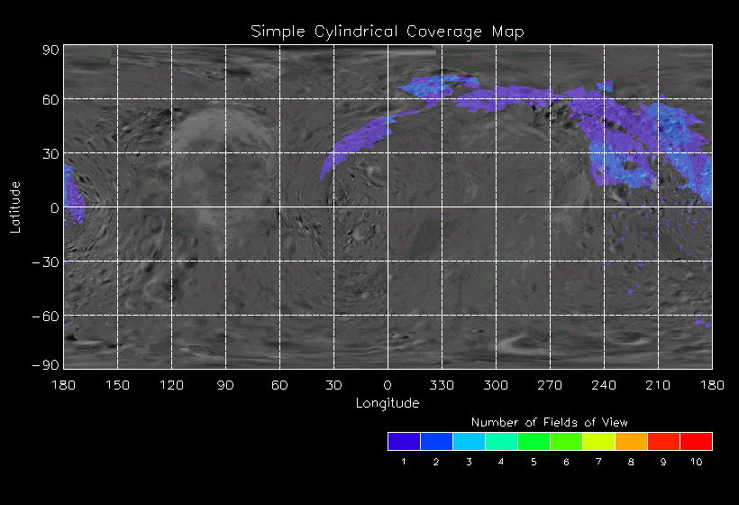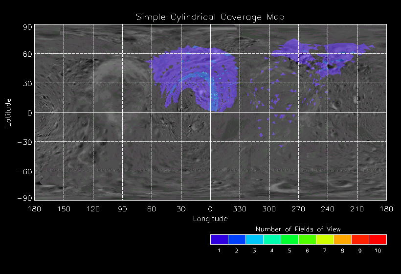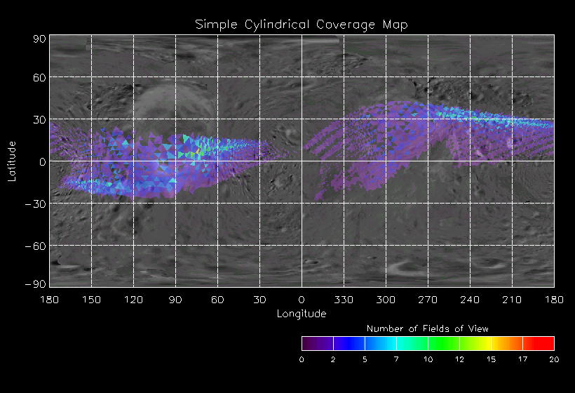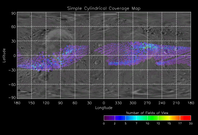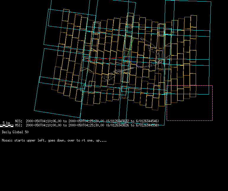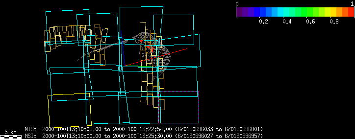| KB | NISEquat.Periapsis | 5-Apr | 2000_096 | 0:45:27 | 12:25:06 | 130305755 | 130434131 | 869 | Series of NIS mosaics to cover MSI FOV | Narrow Slit; 4 mirror positions dependent on MSI pointing; 5 sec spectra+ 2rests + 2darks | A series of mosaics to cover as much territory as possible | KB | NISEquat.Periapsis | Cov | AveIoF | AveInc | AveEm | AvePhase | AveRes | Movie | Predict |