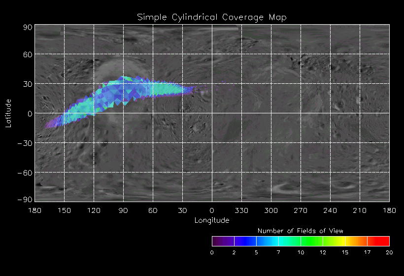 | LN | NISLonScan111 | 20-Apr | 2000_111 | 17:20:02 | 22:51:45 | 131661430 | 131681331 | 3841 | Cover MSI FOV as it scans up and down givin full coverage at 1 longitude | Narrow Slit; Mirror position 73-77 (5sp +2r +2d) calint=5 642 exec. | MSI Continuous 1x4 scan for 1 Eros rotation | LN | NISLonScan111 | Cov | AveIoF | AveInc | AveEm | AvePhase | AveRes | Movie | Predict |