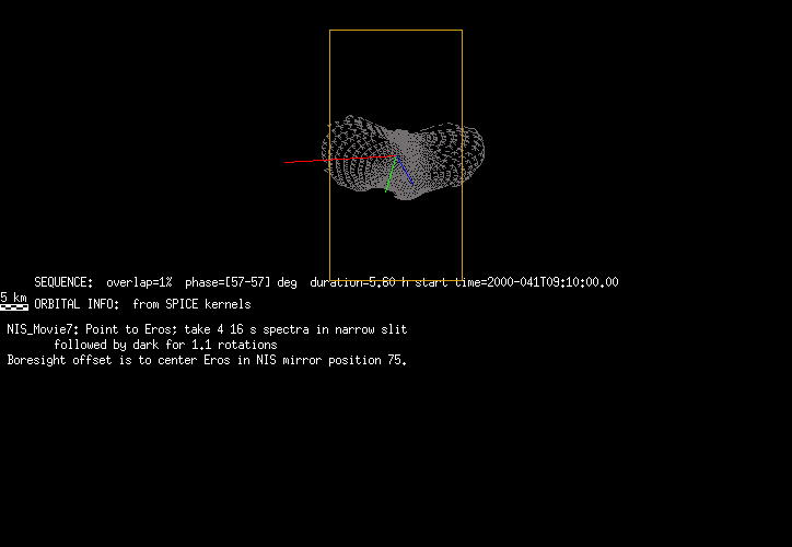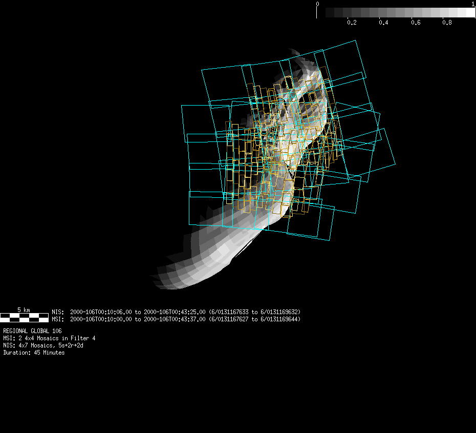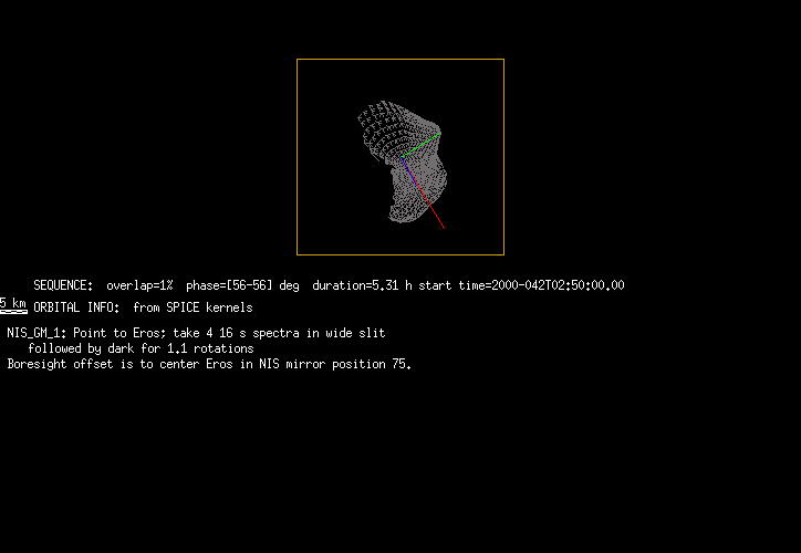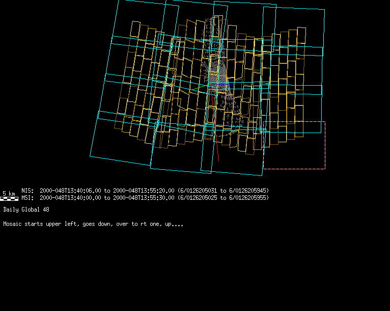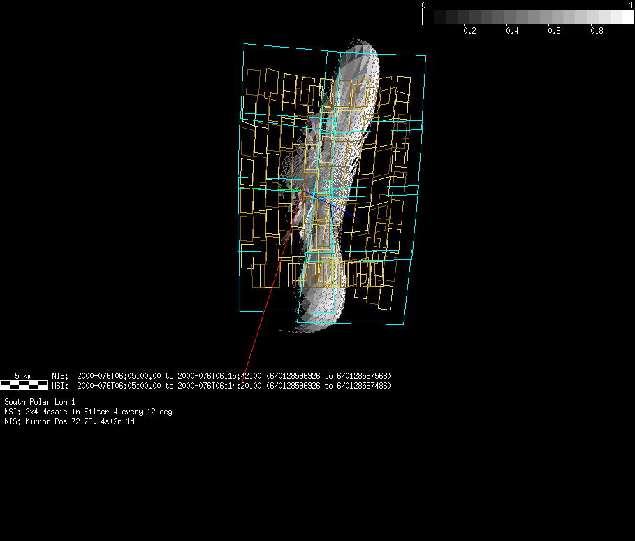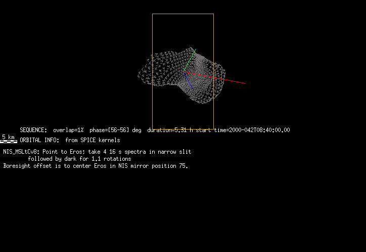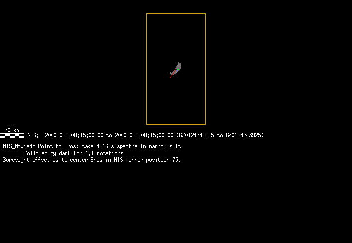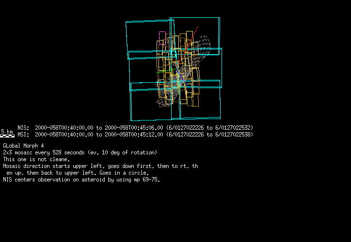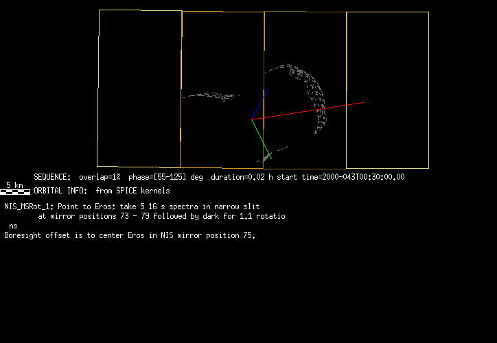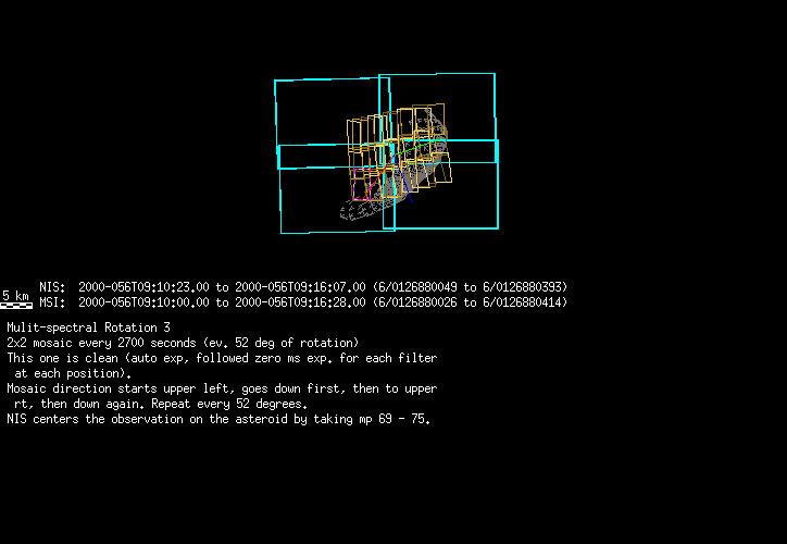 | FY | NIS Multispectral Rotation Seq. | 12-Feb | 2000_043 | 0:30:53 | 6:04:06 | 125725679 | 125745670 | 1380 | Observe Eros when it is 200 MSI pixels in size | Mirror position 73-77 with 16 sec spectra+ 2rests +4darks | MSI Point to Eros | FY | NIS Multispectral Rotation Seq. | Predict | |||||||