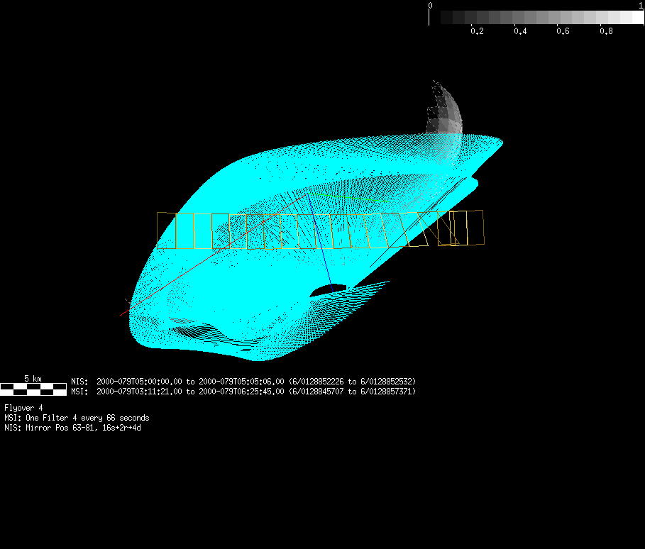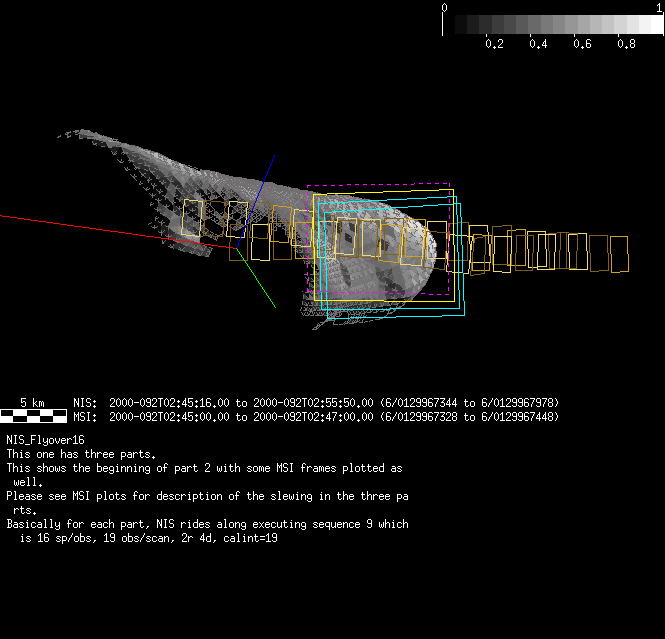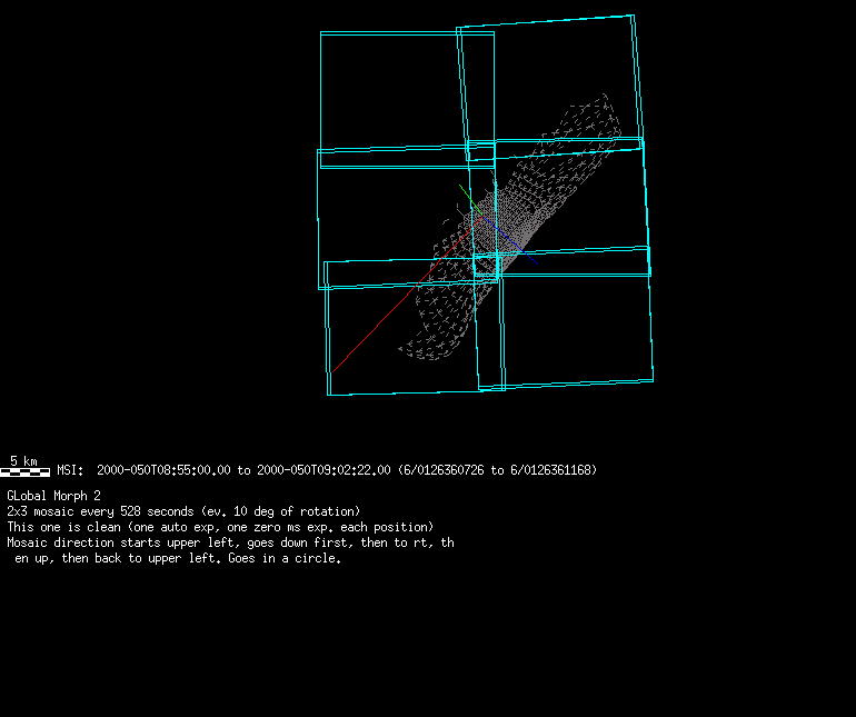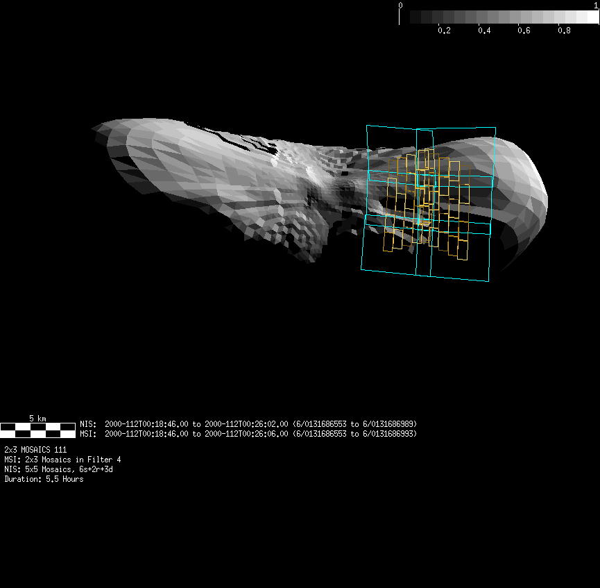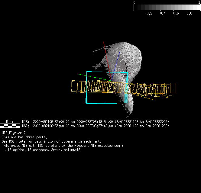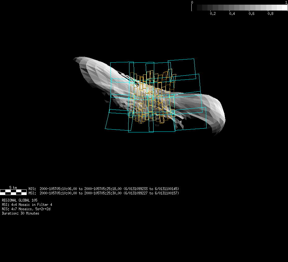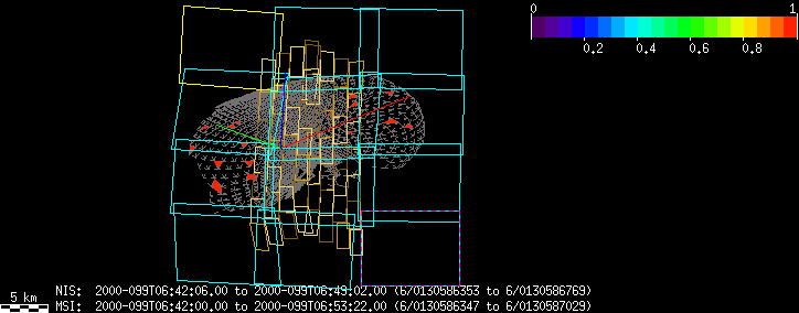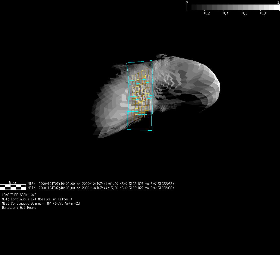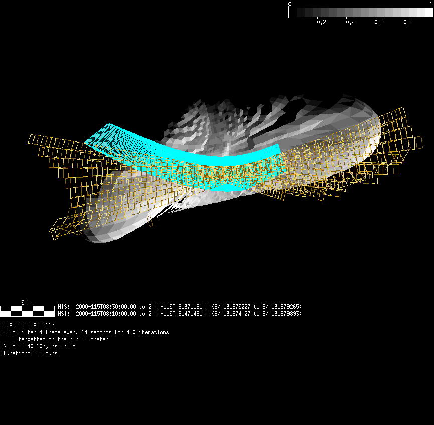 | FY | NIS Multispectral Rotation Seq. | 12-Feb | 2000_043 | 0:30:53 | 6:04:06 | 125725679 | 125745670 | 1380 | Observe Eros when it is 200 MSI pixels in size | Mirror position 73-77 with 16 sec spectra+ 2rests +4darks | MSI Point to Eros | FY | NIS Multispectral Rotation Seq. | Predict | |||||||