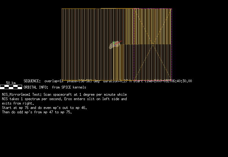 | FS | NIS Mirror Geometry Test 1 | 1-Feb | 2000_032 | 6:40:00 | 7:16:33 | 124797426 | 124799617 | 1860 | Calibration | Test mirror steps; Mirror position 76 to 46 odd and 47 to 75 even; 58 1 second spectra per mirror step | Point to Eros and scan; MSI Images every 12 seconds when NIS on mp 72 - 79 | FS | NIS Mirror Geometry Test 1 | Predict | |||||||