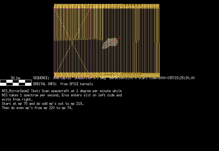 | FT | NIS Mirror Geometry Test 2 | 5-Feb | 2000_036 | 1:10:01 | 3:19:08 | 125123227 | 125130972 | 7360 | Calibration | Test mirror steps; Mirror position 75 to 199 odd and 200 to 74 even; 58 1 second spectra per mirror step | Point to Eros and scan; MSI Images every 12 seconds when NIS on mp 72 - 79 | FT | NIS Mirror Geometry Test 2 | Predict | |||||||