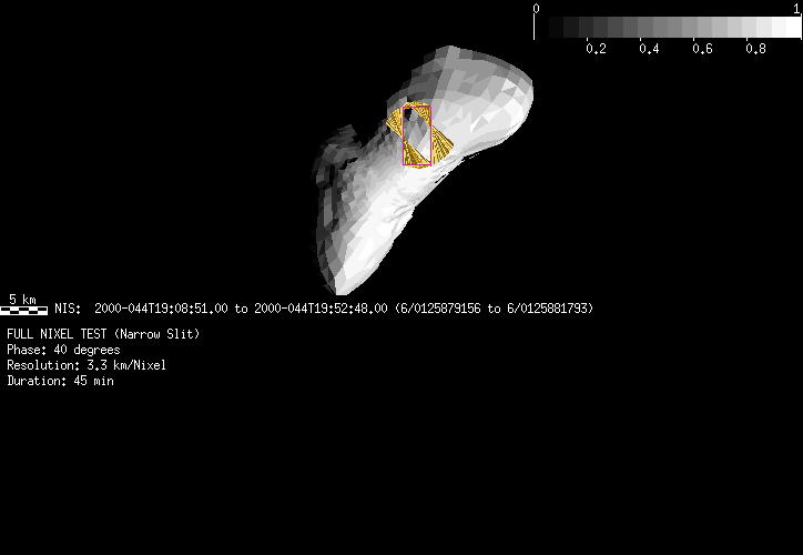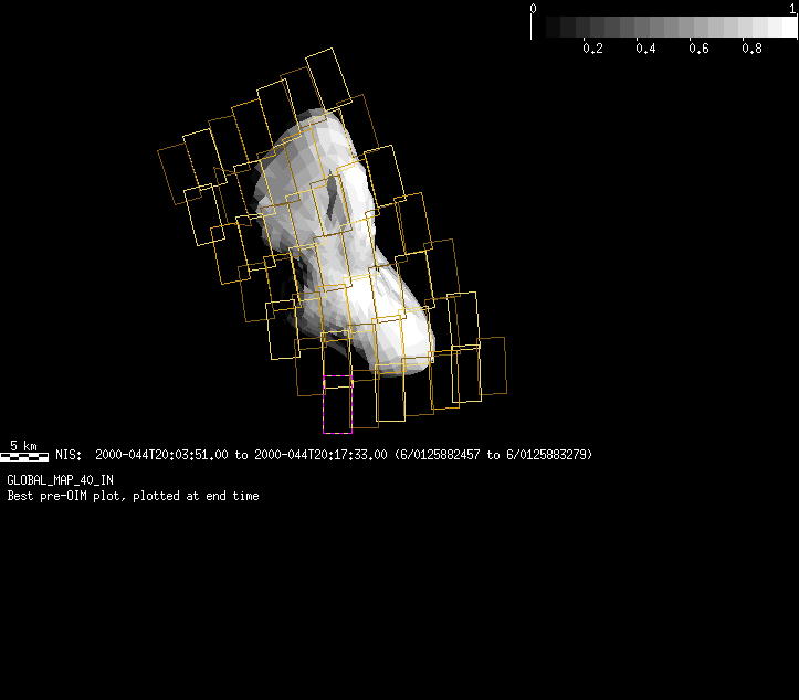 | GF | GLOBAL_MAP_40_IN | 13-Feb | 2000_044 | 20:03:53 | 20:17:55 | 125882459 | 125883299 | 57 | Take a full global map of the asteroid at one phase angle | Narrow Slit; Mirror position 197-203 (7 scans of 16 sec spectra+2r+4dark) | NIS Point to Eros +x axis, scan down x-axis to -x | GF | GLOBAL_MAP_40_IN | Cov | AveIoF | AveInc | AveEm | AvePhase | AveRes | Movie | Predict |