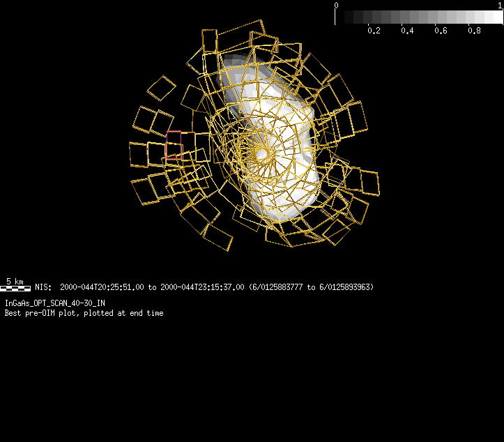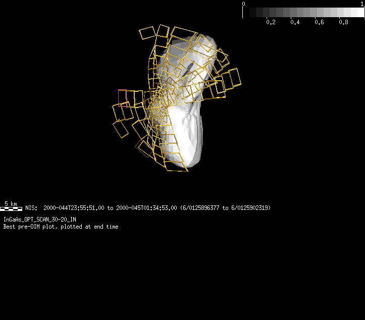 | GI | InGaAs_OPT_LAT_SCAN_30-20_IN | 13-Feb | 2000_044 | 23:55:53 | 1:36:15 | 125896379 | 125902399 | 727 | Take spectra continuously; optimizin the InGaAs | Narrow Slit; Mirror position 199-213 (4 obs/Mirror position 16 sec spec+2r+6dark at each obs) 6 executes | NIS Point to Eros nadir | GI | InGaAs_OPT_LAT_SCAN_30-20_IN | Cov | AveIoF | AveInc | AveEm | AvePhase | AveRes | Movie | Predict |