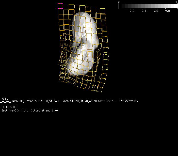 | GL | GLOBALS_OUT | 14-Feb | 2000_045 | 5:48:53 | 6:33:59 | 125917559 | 125920263 | 167 | Take a full global map of the asteroid at one phase angle | Wide Slit; Mirror position 292-308 (8 scans of 16 sec spectra+2r+4dark) | NIS Point to Eros +x axis, scan down x-axis to -x | GL | GLOBALS_OUT | Cov | AveIoF | AveInc | AveEm | AvePhase | AveRes | Movie | Predict |