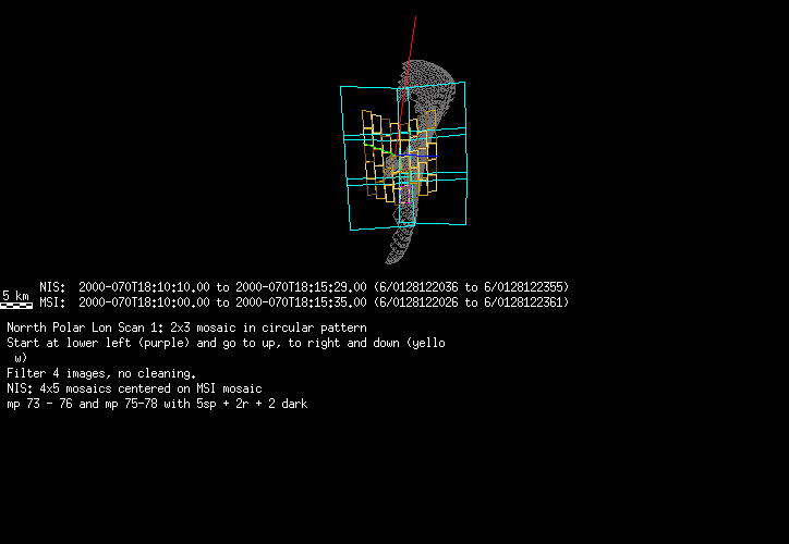 | DA | NIS Multispectral Rotation Contingency | 23-Dec | 1998_357 | 16:09:59 | 21:54:55 | 89839612 | 89860308 | 4825 | Obtain spectra during flyby | Narrow Slit; Mirror positions 72-78, 7x 3sec spectra + 0 rest +0darks | 2x2 interleaced with a 1x1. At closest approach 4x4. | DA | NIS Multispectral Rotation Contingency | Predict | |||||||