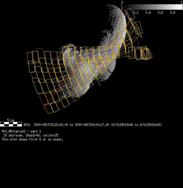 | LI | NISLonScan106B | 15-Apr | 2000_106 | 21:40:02 | 3:11:45 | 131245030 | 131264931 | 3809 | Cover MSI FOV as it scans up and down givin full coverage at 1 longitude | Narrow Slit; Mirror position 73-77 (5sp +2r +2d) calint=5 642 exec. | MSI Continuous 1x4 scan for 1 Eros rotation | LI | NISLonScan106B | Cov | AveIoF | AveInc | AveEm | AvePhase | AveRes | Movie | Predict |