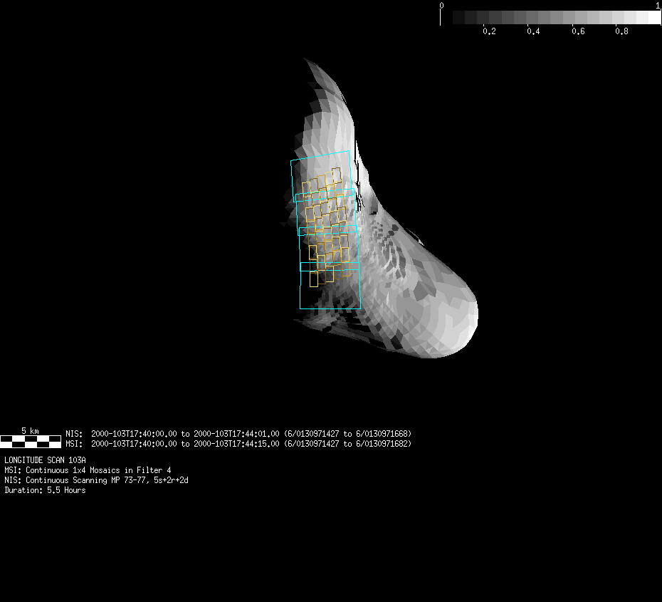 | LA | NISLonScan103A | 12-Apr | 2000_103 | 15:10:02 | 20:41:45 | 130962430 | 130982331 | 3774 | Cover MSI FOV as it scans up and down givin full coverage at 1 longitude | Narrow Slit; Mirror position 73-77 (5sp +2r +2d) calint=5 642 exec. | MSI Continuous 1x4 scan for 1 Eros rotation | LA | NISLonScan103A | Cov | AveIoF | AveInc | AveEm | AvePhase | AveRes | Movie | Predict |